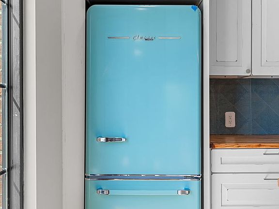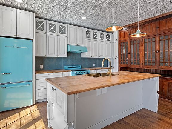 Cozy porchCharming clawfoot tubStylish stand-up tile showerPlenty of cabinet storageButcher block countertopsTwin vanity sinksCustom tile backsplash