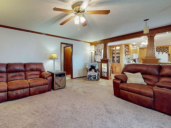 This completely updated ranch home is conveniently located on an oil road just outside the city limits of Hartford, SD which has many amenities including: grocery store and variety shops, Central Valley Golf Course (with Great Life affiliation). Just 10 min from Sioux Falls, this beautiful acreage is surrounded by mature evergreen trees (Colorado Blue and Black Hills Spruce) and has a stone fire pit area with a beautiful country view to the east. Main level has tile floors in the open kitchen/dining, with carpet in the living room and both main floor bedrooms. Kitchen is fully remodeled with custom cabinetry (Troy's Custom Cabinets in Dell Rapids) and appliances are included. Conventional ceilings throughout. Primary bedroom includes on-suite with walk-in closet, large tile shower, double sink vanity with spacious custom cabinetry (Troy's) and heated tile floor. Finished lower level features family room nicely finished in knotty pine with gas fireplace and custom cabinets (Troy's) for television and ample storage, 2 legal bedrooms, both carpeted with cedar lined closets. Large unfinished furnace room with sump pump and ample storage space. $2500 carpet allowance to update carpets in main floor bedroom. Seller's target closing date 4/01/2023. Property Improvements: - Kitchen Remodel - 2000 - Primary Bedroom/Bath Remodel - 2012 - Windows All Replaced - 2006 - Siding Replaced - 2006 - Basement Remodel - 2003 - New Roof - 2014 - Dining Remodel - 2012
