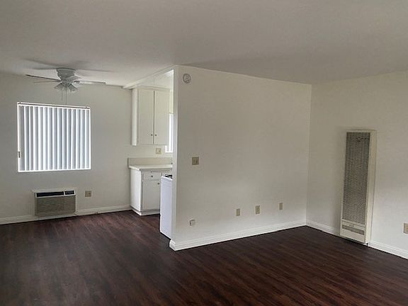 The recently remodeled unit has hardwood floors, a stove, a refrigerator, and a wall a/c unit.