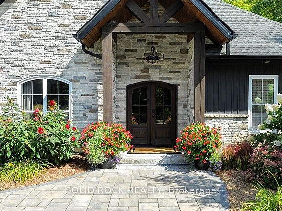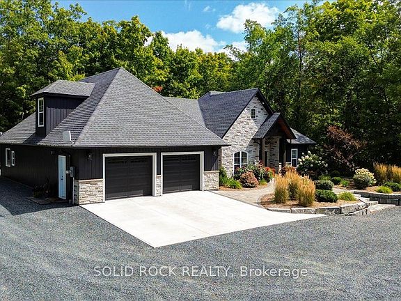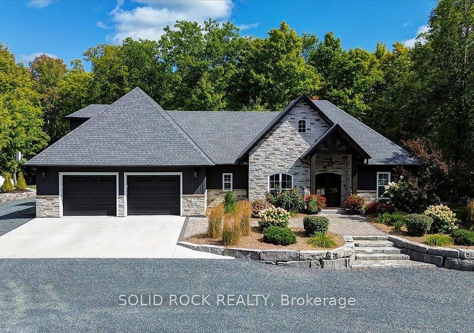 Welcome to this stunning custom-built 4-bedroom, 2.5-bath home nestled on a private, professionally landscaped 1.9-acre lot. Perfectly situated just 5 minutes from all amenities and ideally located between Toronto and Ottawa with convenient access to both airports, this home offers a rare blend of privacy, space, and accessibility. Step inside to a spacious open-concept design featuring a large foyer leading to a living room with a cozy electric fireplace perfect for relaxing or entertaining. The kitchen is a true showstopper, boasting a unique live-edge center island ideal for casual dining and gatherings, complemented by a large walk-in pantry for ample storage and functionality. Radiant in-floor heating throughout including the oversized double-car garage ensures year-round comfort. The primary bedroom was thoughtfully designed to offer a peaceful sanctuary away from the main living area with a luxurious 5-piece ensuite bath and an extra-large walk-in closet. 3 additional bright and spacious bedrooms, a 4-piece bathroom which is conveniently located for family and guests. An additional family room with a 2-piece bath provides flexible space suitable for an extra bedroom, home office, or media room. A main-floor laundry adds to convenience and practical living. Step outside to experience exceptional outdoor living with a covered porch perfect for all seasons, plus two dedicated fire pit areas ideal for entertaining or quiet evenings under the stars. A grand circular driveway enhances curb appeal and provides ample parking. Two versatile outbuildings offer extra storage, workshop space, or room for recreational gear. The home also includes a GenerLink hook-up for backup power, giving you a peace of mind during outages. This exceptional property combines custom craftsmanship, modern amenities, and serene privacy on a beautiful lot. Easy to show, schedule your appointment today and dont miss this outstanding opportunity.