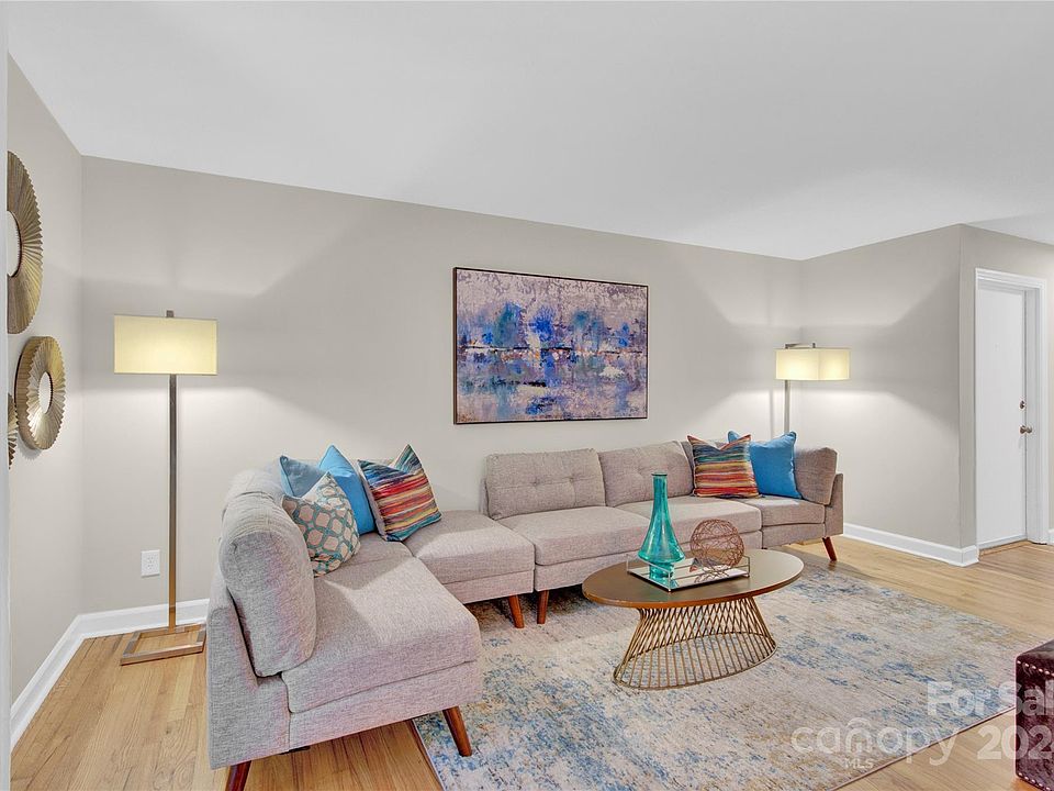 Spacious one-bedroom condo in Myers Park that is only a mile from Uptown Charlotte. This unit has hardwood floors throughout. It is freshly painted and move-in ready. The unit's private balcony sits low within the tree canopy and feels like a treehouse for adults. The simple galley kitchen has plenty of countertop space for your cooking and prepping needs. Dining room features a brass chandelier. The long rectangular living room can be subdivided into two spaces. The first space, closest to the entrance hallway is perfect for TV/entertainment. The second space, bounded by a 10’ glass door overlooking the tree canopy-enshrouded balcony is ideal for an after-work glass of wine. The spacious bedroom accommodates a king-sized bed and full dresser and is replete with a shelved walk-in closet. This unit was completely renovated in 2021. Brand new refrigerator will convey. Very convenient location, walking distance to groceries, shopping, restaurants and greenway. Please come and see it.