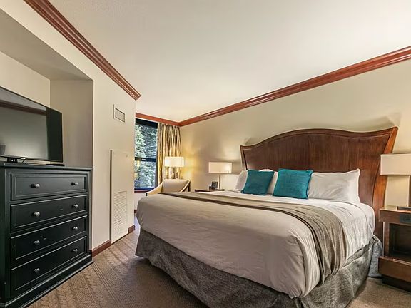 Two bedroom condo with views of the forest that surrounds the Everline Resort and is what makes Olympic Valley a coveted ski and recreation area. The 2-bedroom fireplace suite offers a master bedroom with a king, and separate shower/tub a kitchenette+living/dining spaces. There is also a 2nd bedroom with a King and ensuite bathroom The Everline facility has dining, shopping, fitness and onsite recreational options year-round. It's also a popular wedding and conference spot. A stunning location. Please inquire for details