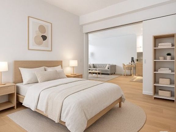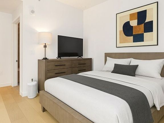 Expansive floor-to-ceiling windowsSleek cabinetryImpressive cityscape viewsOpen-concept layoutQuartz countertopsStainless-steel appliancesIn-unit laundry