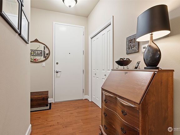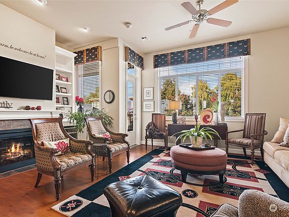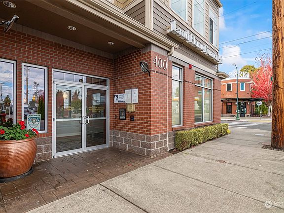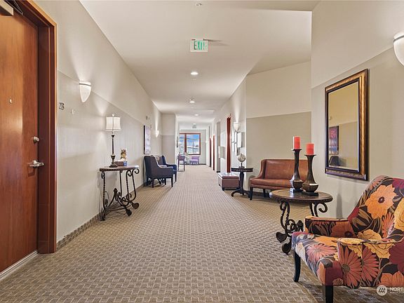 Welcome to Downtown Puyallup's Luxury 55+ Condominium Building. This open concept one story 2 bed, 1.75 bath with 10 ft ceilings, hardwood floors, granite countertops & stainless-steel appliances, a generous primary bedroom with ensuite, a small office is at the end of the hallway and a deck to sit and enjoy while relaxing and looking out at the park and Pavillion. The building features A/C, elevator, secure entry & garage, community entertainment/ exercise room, individual storage & more. Located steps from Pioneer Park, Pavilion, Farmers Market, Library, Senior Center, shops, amenities and easy access to freeways, hospitals and the sounder.