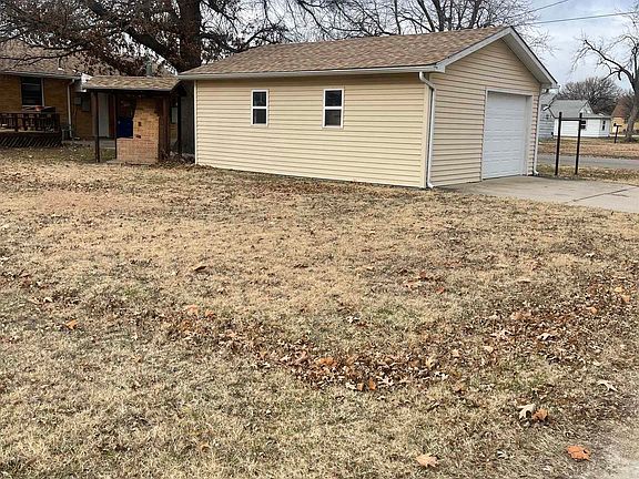 GREAT SNALL TOWN LIVING. Only 15 to Hutchinson and McPherson. Brick ranch style home has 3 bedrooms, the 3rd bedroom does go out to the deck which has been used as a formal dinning room. You could do the same or turn it into the laundry room as well. Many options. This home has beautiful hardwood floors, all new paint up stairs, all the appliances do stay with home, including the washer and dryer, microwave. Large family room in basement with bar and bar stools, as well as a full bath. Does have the older egress window. The home has 2 car attached garage with storage, also has a carport that comes into the main garage. Main garage has remote and also key pad. Now, what is even more amazing is that it has a 1 car detached garage that you can go through the alley. You could also use this as a work shop. This home has adult beautiful trees with a deck in back, with a nice brick grill in back.