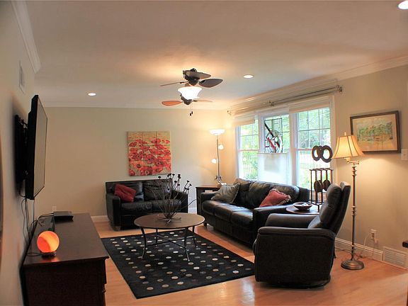 The house you've often admired - charming 3 bedroom 2 bath ranch totally renovated in the last 10 years. Drive up the circle driveway, take one step up to enter the foyer and light-filled living room with hardwood flooring. Living room opens to dining room which has sliding doors to spacious deck overlooking fenced yard. Newer kitchen open to breakfast room and also opens to deck. Master bedroom features hardwood flooring, special coffered ceiling, huge (9X13) walk-in closet, and adjacent full bath with tub and separate shower. Two more nice sized bedrooms also with hardwood flooring and another beautiful bath complete the first floor. House has beautiful mill work, ceiling fans throughout, canned lighting in living room, and even a laundry chute! Lower level has large family room for space to spread out, plus lots of storage space with shelving, and the laundry room. One car attached garage enters into bedroom Breakfast room currently used as office.