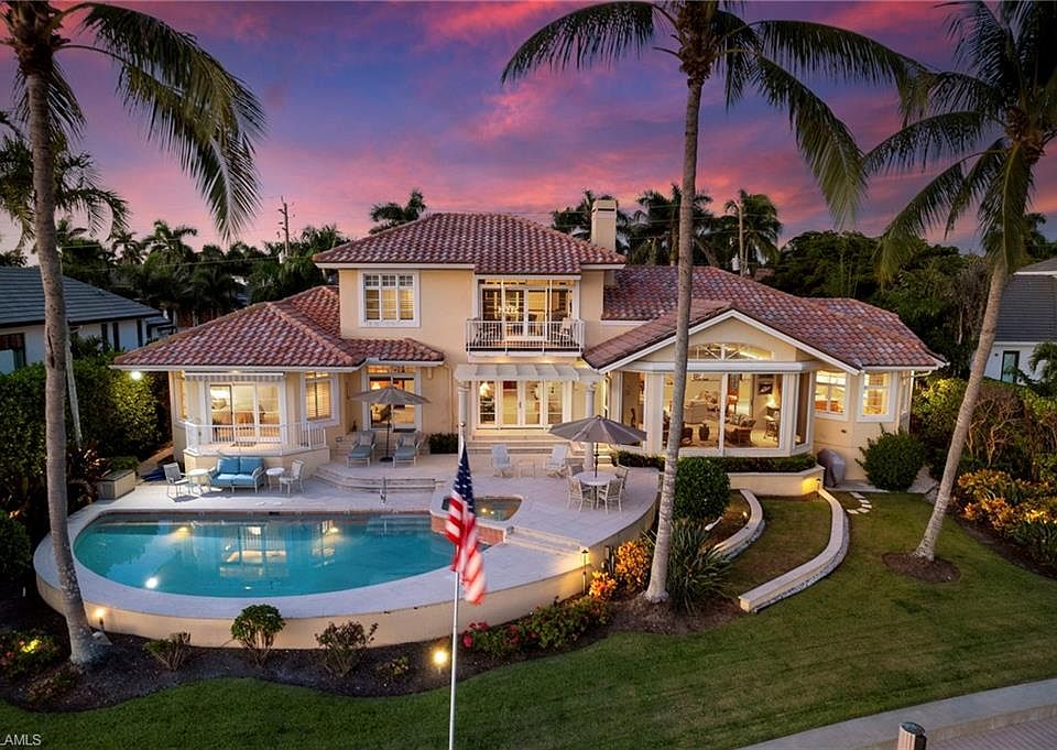 H9605. Gorgeous waterfront home on Hurricane Harbor in The Moorings - just .8 mile to the private Moorings Beach! Enjoy the delightful wide bay southern exposure views from every room & sunset from the Moorings Beach! Built by renowned Frontier Custom Homes, this is a solid one owner custom 3 bedroom, 3.5 bath home plus office, providing one level living on the first floor & plenty of room for guests. The pride of ownership shines through with a welcoming design that begins at the paver driveway and continues as you enter the foyer with a 20’ vaulted ceiling, grand staircase and balcony, sporting unobstructed water views. The style of the home is a seamless blend of elegance, tropical warmth, and traditional touches. Entertaining and cooking is a pleasure in the updated kitchen with large island, bar, wine cellar & walk in pantry. Take your choice to sip morning coffee from the breakfast nook, lanai or pool deck as you overlook the bay and swaying palms! The second floor includes a loft living area, bedroom, full bath and relaxing balcony overlooking the private dock & harbor. This is truly your own self-contained resort and yet super close to all amenities. Explore a short boat ride to the Gulf of Mexico via Doctors Pass, known as a fisherman’s delight. Come see this amazing home and make it yours today!