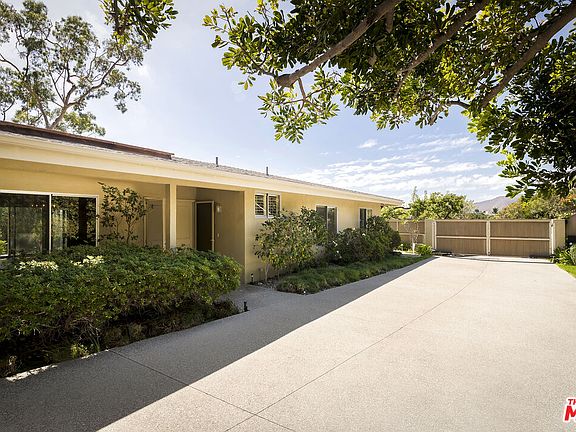 Perched above the Getty Villa on a private 16,483 sq ft lot, this fully gated single-story residence captures both ocean and mountain views while offering unmatched privacy and charm. The 2,556 sq ft home features 3 bedrooms and 3 bathrooms, blending midcentury character with warm natural light throughout. Inside, floor-to-ceiling sliding doors and a sun room create bright, airy living spaces anchored by two fireplaces and a built-in alcove bench with shelving. The kitchen showcases original midcentury wood cabinetry with ample storage and counter space. The primary suite offers a generous walk-in closet and ensuite bath with both shower and tub. Outdoor living is seamlessly integrated with multiple points of access to a covered side patio, a pergola for shaded lounging, and a flat grassy pad framed by lush landscaping. Mountains rise behind while ocean views extend ahead, creating a tranquil coastal setting untouched by recent fires. A two-car garage, ample driveway parking, and a Generac 16,000-watt whole house generator provide both convenience and peace of mind. With direct access to scenic hiking trails and just moments from Palisades Village and the beach, 400 Surfview Dr offers a rare opportunity to enjoy hillside serenity in a premier coastal location.