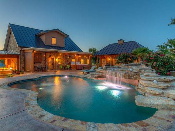 Welcome to one of a kind Hill Country ranch offering 43 secluded acres off Hoover Valley road with nearly 7200â sq foot smart home completed in 2014. Open floor plan 2 story main house consists of expansive great room, kitchen with separate chefâs pantry, game room, 2 bedrooms, 3.5 bathrooms, 2 open lofts with Murphy beds, office, multiple bonus spaces, and much more. Well-appointed outdoor kitchen connects the main house to the pool, separate spa, and nearby pool house. Panoramic views of 1 acre spring fed pond from almost anywhere inside or out. Multiple outbuildings including log cabin, finished barn with upstairs apartment, bonus sleeping quarters above 3.5 car garage, private chapel, 8 stall dog kennel with run, 1500 square foot metal pole barn for storage, and well house with 60gpm well. Land is Ag exempt, cross fenced & includes 2 remote controlled gates. Property consists of primarily mature oaks, cedars recently cleared. Inconspicuous solar panels generate large percentage of power needed for property. No use restrictions on property, can be used as a grand family estate, corporate retreat, or bed and breakfast â as currently furnished ranch sleeps 22 comfortably! Too many unique features to list â schedule your showing today!