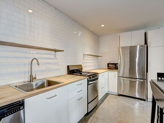 Open living layoutPocket sliding doorsGarbage disposalSubway tile backsplashBuilt-in cabinetryStainless steel appliancesWood countertops