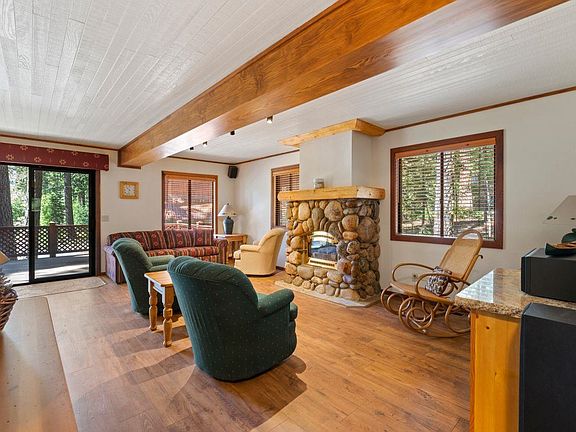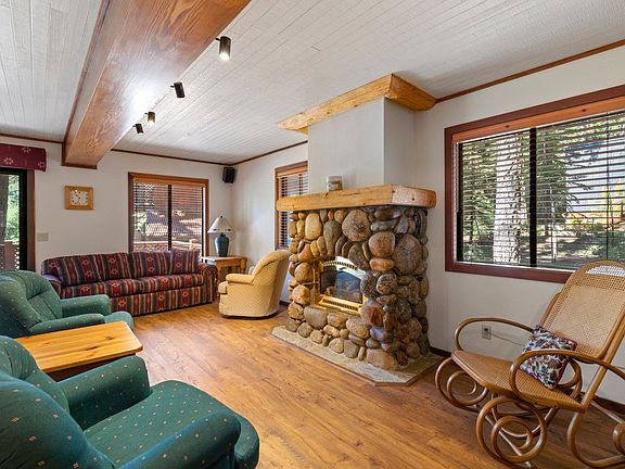 The floor plan is exceptionally clean and efficient, highlighted by a wide stairway and spacious halls. The ground floor encompasses the kitchen, living and dining areas, a laundry room, one bedroom, and a bathroom. An Xtrordinair gas fireplace is framed with river rock in the living room. The upper floor features two generous bedrooms and a beautifully appointed bathroom. The main home has been updated with Air Conditioning. Furthermore, there is a massive, oversized two-car garage with a studio recreation room above. This versatile room includes a full bath, a small sink, and a refrigerator. Every space has been meticulously updated with the finest materials, including granite countertops, high-end appliances, and superior craftsmanship.