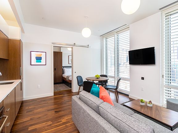 *Please note: this is a short term rental available through May 30. We do not have availability for leases past that date at this time.* Pod Pads are fully furnished apartments situated at the top of Pod Times Square Hotel. We offer the convenience and hospitality of a boutique hotel with all the comforts of home! This Two Bedroom / Two Bath unit has city skyline views, including the Empire State Building! Please note that these units have a minimum stay of 30 nights. We also offer larger two bedroom apartments, as well as one bedroom units. Visit our website for pricing for your specific dates. All utilities, high speed WiFi, phone service, premium cable, and access to our onsite gym are included. Contact us to schedule an in person or virtual tour today! Top tier furnishings, appliances, housewares, and cookware make this unit move in ready: + Fully furnished with designer fixtures and top of the line appliances. + Bertazzoni oven, Blomberg dishwasher and refrigerator paneled with custom mill work and quartz counter tops. + Kitchens are stocked with all necessities including cookware, dishware, and silverware. + Elegant walnut hardwood flooring. + Top of the line Hansgrohe plumbing fixtures. + Individual climate control in each bedroom and living area. + Built in bookcases and ample storage + Three flat screen TVs. + Package and mail receiving. + Front desk & maintenance team. + High speed Wi-Fi + Premium cable. + Landline with free local calling. + Rent payable by credit card with no processing fee. $1500 refundable security deposit. Book instantly.