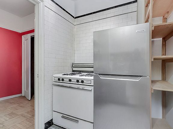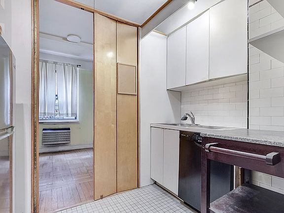 Currently configured as a two-bedroom, one-bath residence, the apartment features a gracious entry foyer that leads to a spacious living and dining area, complete with herringbone hardwood floors and elegant crown moldings. Generous closet space enhances functionality, while the versatile floor plan allows for multiple reconfiguration options—such as opening the kitchen to create a more expansive dining space, or maintaining the current layout as a one-bedroom with a second bedroom or home office.