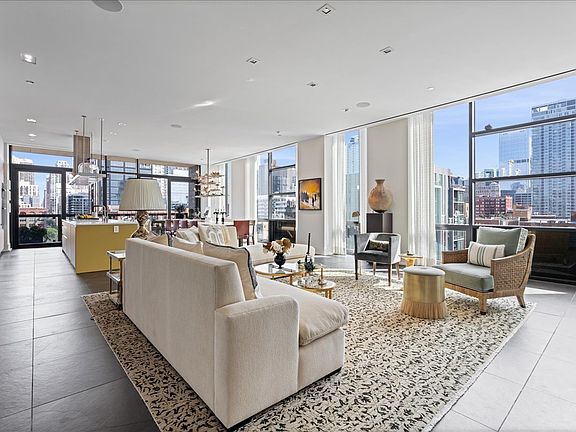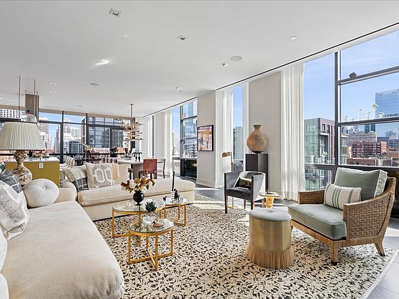 Design-forward and contemporary with flawless fixtures and finishes throughout, 400 W. Huron St., unit 801, is a 3,065-square-foot, 3 bed/3 bath luxury condo in the heart of River North with an impressive indoor-outdoor footprint. Located on a posh stretch of Huron, close to lifestyle amenities at BIAN and East Bank Club, this professionally designed home begins with an open foyer that features high ceilings, Venetian plasterwork, dark gray slate flooring, and an adjacent, custom-designed coat closet that links to a bonus, walk-in storage room. Via an interior gallery hall that affords access to a jewel box powder room with a hand-painted wallcovering by de Gournay, the entry also connects to a natural-light-filled, 20' x 36' great room that encompasses a trio of elevated spaces for entertaining and everyday living: a grand living room, a corner-positioned dining room, and a modern chef's kitchen. The living room boasts beautiful, built-in bookshelves including a custom magazine rack and floor-to-ceiling windows that frame spectacular skyline views. The dining room delights with a Parisian pendant light and space for a 10-person table. The beautifully appointed, custom kitchen features seamless Italian cabinetry, white quartzite countertops, Miele appliances including a double oven, a large island that seats four, and a built-in bar with floating glass shelves. Better still, the kitchen and dining room connect to an incredible 9' x 46' terrace with an abundance of space for outdoor dining, lounging and grilling. Both of this home's secondary bedrooms are exquisitely designed and offer access to full baths with polish and personality. (One of the two secondary bedrooms is currently styled as a fashionable library with a custom media center with shelving and cabinetry, but the room can easily be transitioned back to a bedroom based on preference.) There's also a tucked-away home office with a built-in, L-shaped desk for working from home. On the opposite side of the floor plan, this home presents a spectacular primary suite that begins with a long hallway with more built-in custom storage (both cabinets and drawers) that's followed by a corner bedroom with two full walls of windows, a seating area, decorative eglomise (gilded glass) wall panels, a custom 11' x 17' dressing room with styling island, and a spa-like marble ensuite bath with dual vanity, soaking tub, a deluxe shower, and a separate water closet. Callout details include custom millwork, paint, and wallcoverings throughout, designer lighting and window treatments, high-end custom finishes and plasters by Simes Studios, handmade laser-cut light panels, state-of-the-art AV, and full home automation including electric shades and mood lighting. Building amenities include an incredibly chic lobby with door staff, a fitness center, a dog run, private wine lockers, and two garage parking spaces. (Pets allowed.) Steps to James Beard Award-winning restaurant Obelix, blocks from the Chicago River and the Design District, and minutes from the world-class shopping, dining and culture that surround the Mag Mile, 400 W. Huron St., unit 801, is one-of-a-kind luxury living with total privacy, turnkey comforts, and high style.