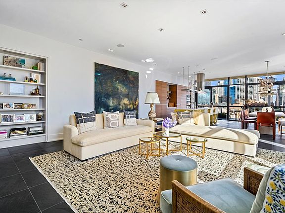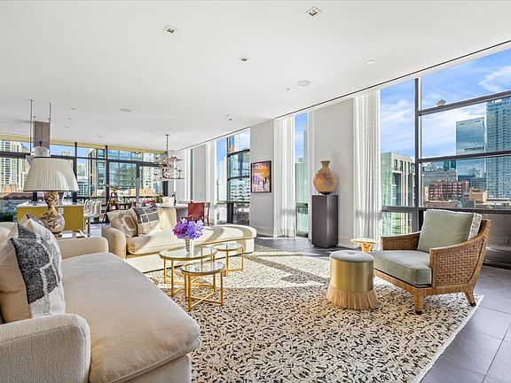 Design-forward and contemporary with flawless fixtures and finishes throughout, 400 W. Huron St., unit 801, is a 3,065-square-foot, 3 bed/3 bath luxury condo in the heart of River North with an impressive indoor-outdoor footprint. Located on a posh stretch of Huron, close to lifestyle amenities at BIAN and East Bank Club, this professionally designed home begins with an open foyer that features high ceilings, Venetian plasterwork, dark gray slate flooring, and an adjacent, custom-designed coat closet that links to a bonus, walk-in storage room. Via an interior gallery hall that affords access to a jewel box powder room with a hand-painted wallcovering by de Gournay, the entry also connects to a natural-light-filled, 20' x 36' great room that encompasses a trio of elevated spaces for entertaining and everyday living: a grand living room, a corner-positioned dining room, and a modern chef's kitchen. The living room boasts beautiful, built-in bookshelves including a custom magazine rack and floor-to-ceiling windows that frame spectacular skyline views. The dining room delights with a custom Parisian chandelier and space for a 10-person table. The beautifully appointed, custom kitchen features seamless Italian cabinetry, white quartzite countertops, Miele appliances including a double oven, a large island that seats four, and a built-in bar with floating glass shelves. Better still, the kitchen and dining room connect to an incredible 9' x 46' terrace with an abundance of space for outdoor dining, lounging and grilling. Both of this home's secondary bedrooms are exquisitely designed and offer access to full baths with polish and personality. (One of the two secondary bedrooms is currently styled as a fashionable library with a custom media center with shelving and cabinetry, but the room can easily be transitioned back to a bedroom based on preference.) There's also a tucked-away home office with a built-in, L-shaped desk for working from home. On the opposite side of the floor plan, this home presents a spectacular primary suite that begins with a long hallway with more built-in custom storage (both cabinets and drawers) that's followed by a corner bedroom with two full walls of windows, a seating area, decorative eglomise (gilded glass) wall panels, a custom 11' x 17' dressing room with styling island, and a spa-like marble ensuite bath with dual vanity, soaking tub, a deluxe shower, and a separate water closet. Callout details include custom millwork, paint, and wallcoverings throughout, designer lighting and window treatments, high-end custom finishes and plasters by Simes Studios, handmade laser-cut light panels, state-of-the-art AV, and full home automation including electric shades and mood lighting. Building amenities include an incredibly chic lobby with door staff, a fitness center, a dog run, private wine lockers for 80 bottles, and two garage parking spaces. (Pets allowed.) Steps to James Beard Award-winning restaurant Obelix, blocks from the Chicago River and the Design District, and minutes from the world-class shopping, dining and culture that surround the Mag Mile, 400 W. Huron St., unit 801, is one-of-a-kind luxury living with total privacy, turnkey comforts, and high style.