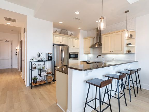 Enjoy the skyline from the absolutely stunning condo in the heart of Downtown Raleigh! Spacious floor plan with 10.5' ceilings make the space feel large and open. Tons of natural light! Custom built-in window seat with extra storage creates a unique niche to enjoy the views while sipping a coffee or enjoying a good book. The unit has a large walk-in closet, soft close drawers in kitchen, new kitchen faucet, bedroom features french doors with cellular shades and a transom window. Heat pump installed in 2019, hot water heater in 2022. New floors 2022 constructed with renewable materials and sustainably sourced, subway tile in kitchen, built-in instant hot water tap. Facility has rooftop pool, gym, social room, doorman in lobby, and 4X4' storage unit in basement. Secure, assigned garage parking. A truly welcoming community!