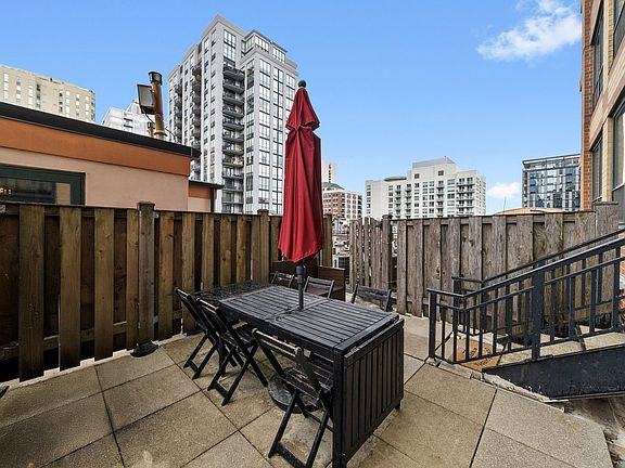 Unheard-of OVERSIZED PRIVATE BALCONY/PATIO in River North! This expansive outdoor oasis perfectly complements your open-concept 1BR condo-ideal for entertaining. The remodeled kitchen with a versatile breakfast bar flows seamlessly into the living area, all highlighted by sleek engineered bamboo flooring. Floor-to-ceiling windows in both the living room and bedroom flood the home with natural light and showcase beautiful city views. Additional features include in-unit washer/dryer, central heat/air, three closets, and deeded garage parking available for $35k. The building offers top amenities: 24-hour door staff, on-site manager, fitness center, bike room, and is pet-friendly. Assessments include cable and high-speed internet. Perfectly situated near a riverfront park, East Bank Club, top restaurants, coffee shops, and public transportation-just a short walk to downtown. Whether you're looking for a full-time home, a city getaway, or a smart investment, this property checks every box. Explore it in 3D-click the virtual tour button to walk through every detail!