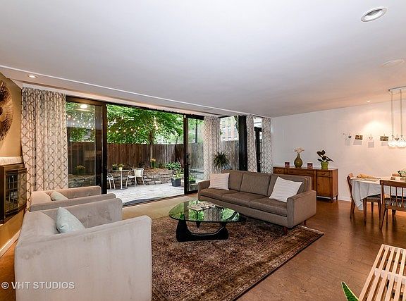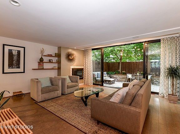 Fabulous Mid-Century townhouse in an awesome East Lakeview location next to the lake & in highly sought after Nettlehorst School District! HUGE PRIVATE OUTDOOR TERRACE off the living room that has been professionally landscaped & along w/the front yard make this townhouse feel like a single family home. Spacious living rm w/fireplace & custom floor-to-ceiling doors that open up to bring the outdoor living in for an amazing OASIS IN THE CITY experience...perfect for entertaining or simply relaxing w/a good book. Nicely-sized Kitchen overlooks the front yard & features great counter space & new appliances. Large Media/Family Room w/authentic mid-century fireplace has a 100 inch projection screen w/surround sound. Open staircase leads to the bedroom level w/remodeled master bath & walk-in closet, skylights & 2nd floor balcony. Newer roof, energy-efficient windows, remodeled baths, Elfa Shelving are just a few of the recent improvements. Huge utility & storage rm & garage prkng included!