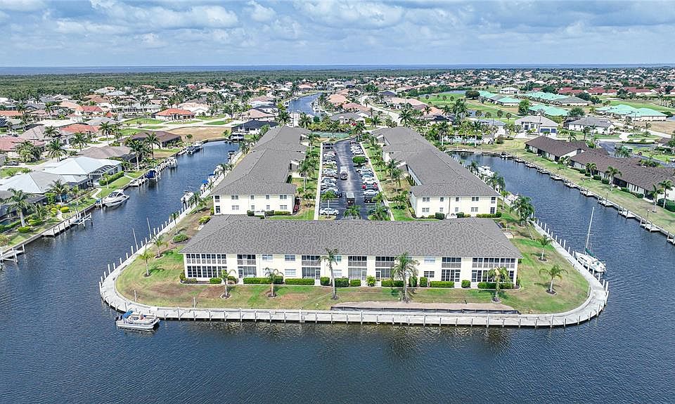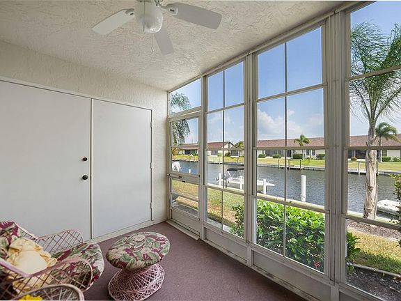 If you are looking for a TURNKEY FULLY FURNISHED, GROUND FLOOR condo residence located in a friendly and well established community, then Spinnaker Point is just what you have been seeking. RECENTLY PAINTED INSIDE WITH NEUTRAL COLORS. A wonderful community nestled in beautiful Punta Gorda Isles, surrounded by a network of City maintained canals and concrete seawalls leading to Charlotte Harbor and the Gulf of Mexico, where you can enjoy our beautiful weather, sailing, and fishing. Docks are available for boats up to 30 feet on a first come, first served basis for either your power boat or sailboat. Beautiful canal views from this first floor, recently painted with neutral colors condo that can be your winter retreat or an investment rental unit. The Kitchen is tiled and has granite counter tops and stainless appliances. The kitchen also has decorative back lit crown molding and there is a bistro table that is the perfect spot for enjoying your morning coffee. The recently carpeted dining room and great room combo, overlooks the canal and has access to the lanai through sliding glass doors. The screened in lanai also has a built in closet for storing your bicycles, fishing poles, coolers, beach chairs, etc. Simply walk out your back door and enjoy a brisk walk around the wrap around dock that encompasses the entire complex. The Primary Bedroom Suite has been remodeled with double quartz top sinks, King Size bed, tiled and glass door shower, and has an ample walk in closet. The guest bedroom is equipped with a Murphy bed and the guest bath has a tub and shower combo. A washer and dryer is conveniently located inside the unit. Spinnaker Point has 70 units with low monthly maintenance fees, New Roof, and nearly 1,500 feet of seawall, providing ample space and slips for resident boaters. In addition, a newly updated heated in-ground pool with pool house provides a relaxing area for swimming, and sun bathing. There is also a Tennis Court which can also be used as a Pickle Ball court, and Basketball net. St Andrews, a private golf course is located just across the street, and public courses are just a few minutes drive. Spinnaker Point is located within minutes to famous Fisherman’s Village, Historic downtown Punta Gorda with numerous restaurants, shopping and activities, and major highways and airports. What are you waiting for? Let's do this! Come out and see this great unit!