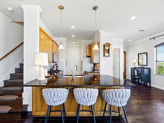 Gas log fireplaceBalcony accessHardwood floorsExtended granite countertopsOpen-concept first floor kitchenStainless steel gas rangeCustom wood blinds