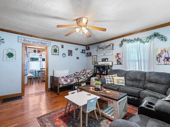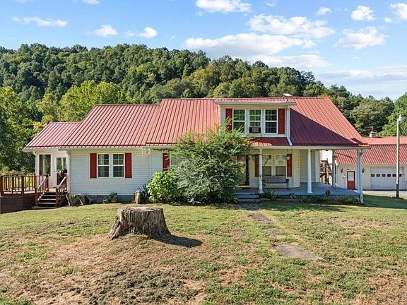 This charming country home is the epitome of tranquility. With stunning mountain views and occasional visits from deer and turkeys, it offers a serene escape. The 4-bedroom, 3-bath farmhouse includes an office, sunroom, and covered front and back porches. The 2-car detached garage features a kitchen, bathroom, and a covered patio leading to a the rock fire pit. Above the garage, there's 500 sq ft of storage space that could easily be converted into a bedroom. The garage is perfect for hosting gatherings with family and friends. All of this sits peacefully on 8 acres of flat land.