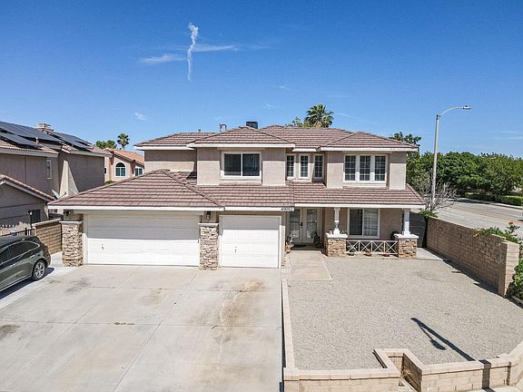 The perfect home in Palmdale! This spacious and inviting residence features 4 bedrooms, 3 bathrooms, and a generous 1,861 square feet of living space. As you enter through the double door entrance, you'll be welcomed by a bright and airy floorplan with high ceilings, laminate flooring, and large windows that fill the space with abundant natural light. A beautifully crafted staircase adds a touch of elegance, and ample storage space ensures a clutter-free environment. The home offers a spacious living room and a well-proportioned dining room, creating the ideal setting for hosting gatherings and making cherished memories. The stunning kitchen is a culinary enthusiast's dream, boasting granite countertops, beautiful cabinets, and tile flooring. An island with bar stool seating provides the perfect spot for casual meals or engaging conversations. The kitchen opens to a lovely family room, complete with a cozy fireplace, offering a seamless blend of comfort and style. The bathrooms are thoughtfully designed with tile flooring and ample storage space, catering to your everyday convenience. Each of the bedrooms is adorned with a ceiling fan/light fixture, ensuring optimal comfort year-round. The Primary bedroom is a true retreat, featuring a walk-in closet and a private bathroom for added privacy and relaxation. Step outside through the sliding door in the Primary room to access your own private deck balcony - the perfect spot to savor tranquil moments outdoors. A convenient laundry room makes household chores a breeze. The huge backyard offers ample patio space for creating your outdoor oasis, with plenty of room for seating and entertaining guests. The property includes a 3-car garage and a wide driveway, providing plenty of parking options. Currently set up as a workshop, the garage offers versatility to suit your specific needs. This corner lot property enjoys a great location, with easy access to the Rancho Vista Golf Course and Rancho Vista Park.