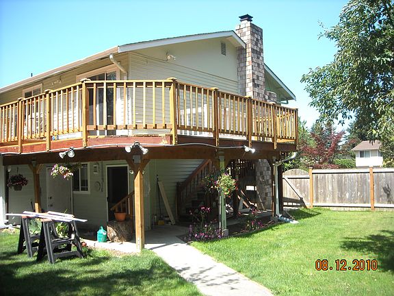 UPDATED 5 bedroom home on large lot with 2 complete living spaces. NEW PAINT, NEW CARPET! The UPPER FLOOR features a gorgeous Kitchen, a Dining & Living area, huge deck, 3 bedrooms, 1.75 Baths including the Master with attached Bath. The LOWER FLOOR features laminate flooring & includes a Kitchen, Living area, 2 Bedrooms, 1 Full Bath & Patio. Perfect mother-in-law setup, or rent out for additional income. Terrific fenced yard w/athletic court. Excellent location- walk to shopping, bus & schools.