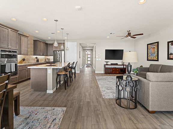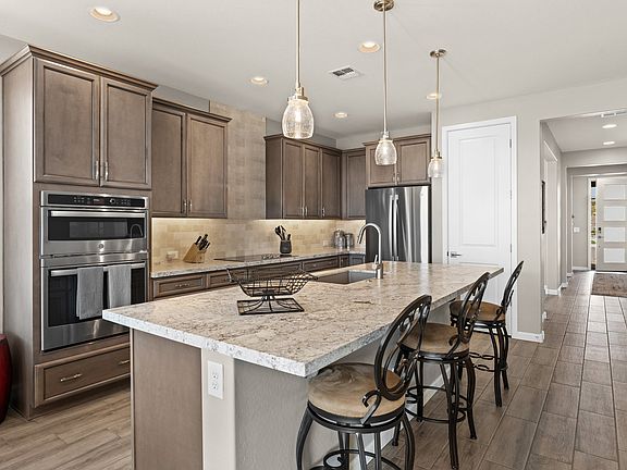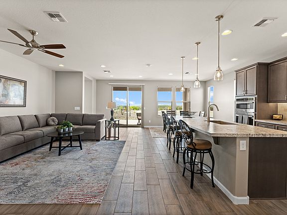 WICKENBURG RANCH. Beautifully furnished with a serene vibe welcome you to this newly built 2 bed, 2.5 bath, with Den and spacious 2-car garage. Room darkening shades are installed in the bedrooms. The well-appointed kitchen features wall ovens/microwave/convection oven combo. The HOA takes care of the landscaping. Enjoy some time on the patio with wonderful views to the south and Vulture Peak. Available 6/15/2025.