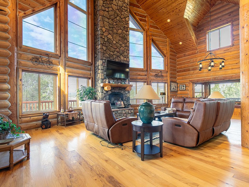 Priced to sell!! Welcome to your serene retreat in Harmony Ridge! This stunning log cabin, nestled on 1.16 acres, offers 3 bedrooms and 2 full bathrooms, thoughtfully designed for comfort and relaxation. Spanning 3,743 sq ft, the home features a main-level master bedroom complete with an ensuite bathroom, ensuring privacy and convenience. Upstairs, two spacious bedrooms invite you to unwind, each with access to a charming balcony that overlooks the lush surroundings. Large windows on the main floor flood the living area with natural light, creating a warm and inviting atmosphere. The property also includes a unique basement accessible from the garage, featuring an additional room and bathroom—perfect for guests or as a personal retreat.