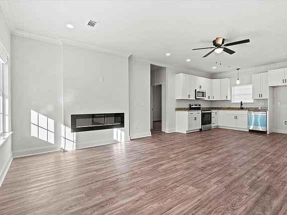 With NO HOA, this new construction home has luxury vinyl plank (LVP) flooring and crown molding seamlessly flowing throughout. Stay cool and comfortable with ceiling fans and recessed lighting, creating a refreshing breeze to compliment the open-concept design. The living room has a stunning electric fireplace room, adding warmth and charm to gatherings with family and friends. The kitchen features granite counters, soft-close cabinets and 42'' upper cabinets for a touch of sophistication. A walk-in pantry offering ample storage space is nearby and spacious laundry room with additional storage. Every detail has been carefully considered to enhance your living experience. This split bedroom plan allows for you to unwind in the primary bedroom, complete with a spacious walk-in closet and a luxurious primary bathroom featuring double sinks and integrated lighting on vanity mirror. Two additional bedrooms will share a hall bathroom with lights integrated in vanity mirror. Home is ready to move in!