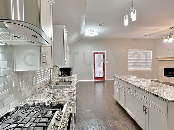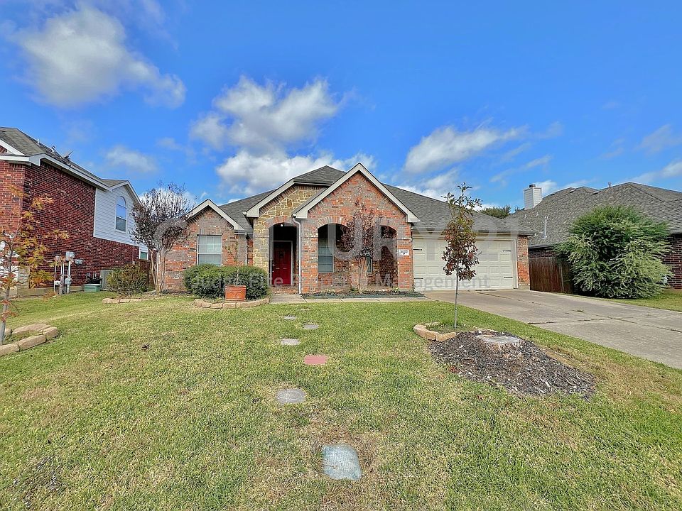 Lease this stunning and spacious single-story 3-2-2 residence, featuring fantastic curb appeal, a desirable open floor plan, a fenced yard, and access to exceptional neighborhood amenities. Front entry leads to a separate formal living and dining combo area. The bright and airy family room, complete with a tile-surround fireplace, seamlessly connects the kitchen, and breakfast area. The crisp and clean kitchen boasts white shaker-style cabinets, gleaming granite countertops, sleek subway tile backsplash, and stainless steel appliances, including a dishwasher, disposal, microwave, gas cooktop with separate oven and modern pendant lighting over the generously sized island. Your spacious primary bedroom features a high ceiling and a stylish sliding barn door leading to the ensuite bathroom. Relax in the spa-like bathroom which includes a modern vanity with dual sinks, a large soaking tub, and a separate, frameless glass shower. Step outside to the fenced backyard with open patio and large grassy area, great for relaxing or entertaining. Residents enjoy access to a community pool, a neighborhood park, and a playground. This home perfectly blends modern amenities with classic comfort. Don't miss the opportunity to lease this beautiful home in a highly desirable neighborhood! Schedule your tour today! Owner must approve all pets.