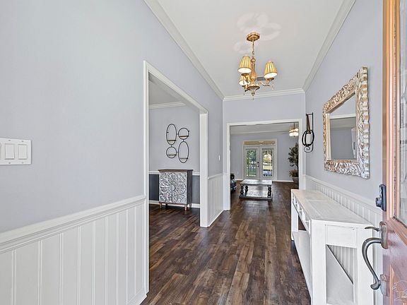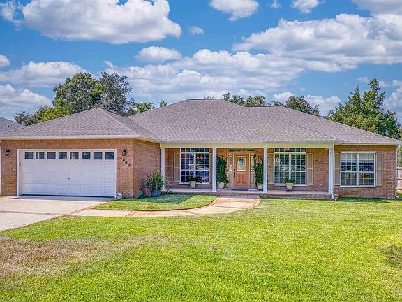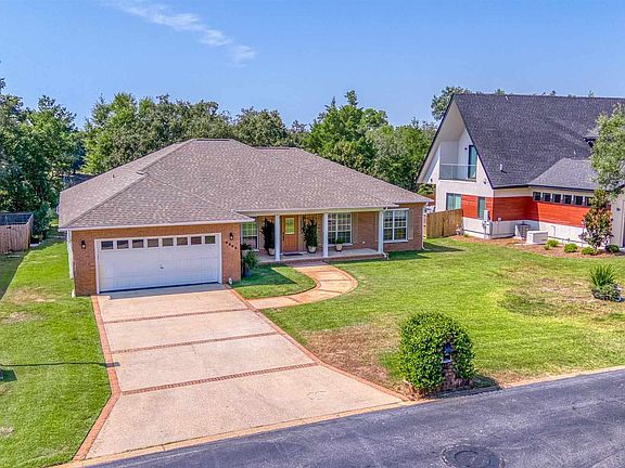 Landfall Subdivision, a desirable maritime community in Perdido Key. This 4 Bed 2.5 Bath single story brick home backs up to a serene pond with mature trees and a variety of colorful healthy potted plants. Step into a bright and inviting foyer with crown molding, wainscoting, a chandelier and soft designer paint creating a welcoming ambiance. Beautiful well-maintained LVP flooring and built-in–shelving with a charming gas fireplace as a focal point in the spacious living room. Open concept living room with natural light from large windows, with seamless flow to adjacent rooms and French doors that allow access to the backyard for indoor-outdoor living. Modern stainless steel appliances, including gas range, built-in microwave, and French-door refrigerator. Honed granite countertops and mosaic tile backsplash compliments the elegant white cabinets and the farmhouse sink. The open floor plan flows into a bright breakfast nook surrounded by windows, with natural light shining in. There is a nice view of the pond from the Primary Bedroom. The bathroom features a freestanding soaking tub beneath a glass block window for great natural light. Dual granite vanities with ample storage and a walk in shower with a sliding glass door. Split floor plan, additional three bedrooms and full bath with a tub/shower combo and double vanities on the opposite side of the house. A half bath located close to the kitchen and laundry room. Laundry room has a deep sink, hanging rod for clothes and cabinets for storage. Large spacious garage. Enjoy the gazebo for picnics and the unlimited view of the Intracoastal waterway from the Marina. A great place to relax, if you're not in your hammock by the pond out back!