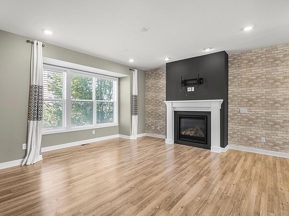 Three level home in Eagan with modern exterior. Model home for the community with premium finishes and fixtures, plus built-in speakers on the lower level. Open main floor with a fireplace in the living room. Eat-in kitchen with stainless steel appliances and a breakfast counter. Balcony off the kitchen. Upstairs are three bedrooms, including a large primary bedroom with ensuite, and the laundry room. Lower level living space and garage access. Blocks away from the Eagan outlet mall, easy walk to transit, and a park across the street.