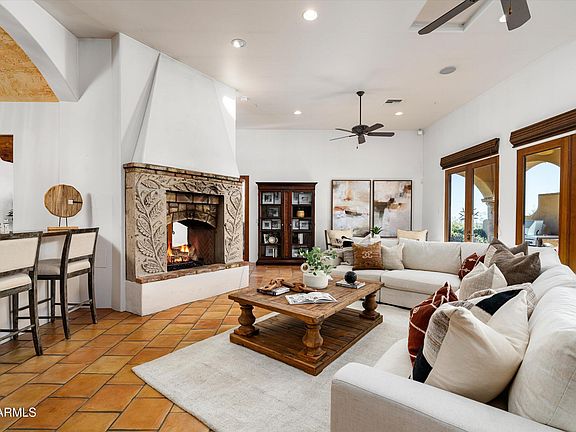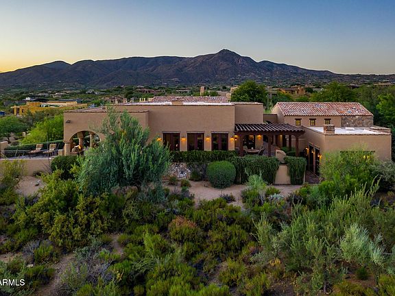Golf Membership Available! Charming European estate perched high on an extraordinary lot in acclaimed Desert Mountain offering mesmerizing city lights, mountain & sunset views! This beautifully designed home features hand-hewn doors, custom French cabinetry, hand-forged iron knobs & handles, star gazing deck, gourmet kitchen with SubZero & Wolf appliances. The main home includes 3 ensuite bedrooms plus office while the private detached guest casita offers a generous sitting area & fireplace which is ideal for guests. The elegant primary suite boasts a private balcony with fireplace creating a serene retreat. The striking two-way Cantera stone fireplace connects the great room & dining room enhancing the warmth & character of the interior. Multiple covered patios, a heated Pebble Sheen... pool spa, & an poolside shower offer the ultimate desert lifestyle. A built-in Wolf barbecue station completes the entertainer's dream.