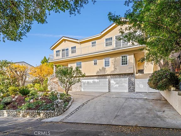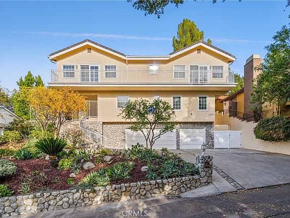 Live in the quaint and historical enclave of Park Moderne, known as The Bird Streets of Mulwood | Nestled in the hills of Calabasas, surrounded by oak trees and custom homes this little enclave is always in high demand | Tucked up off the street with picturesque landscaping | Adding to the curb appeal are citrus and pomegranate trees, drought-resistant succulents, and a boulder accented frontage | The oversized drive is perfect for extra off-street parking | Meandering front steps lead to a gated front courtyard | Step inside to a formal foyer with tall ceil's, Carrara marble floors and white walls | On this lower level are the secondary bdrm suites, they offer newer LED lighting and wood floors, two share the renovated hallway BA while the third has its own private ensuite, also renovated | A wrap around staircase leads to up the expansive and light infused interior w/both indoor and outdoor entertaining venues and an expansive primary bdrm offering an outfitted built-in closet, pitched ceil's, newer windows and slider doors, view balcony and private renovated ensuite BA | Wood floors flow thru-out most of the upper level and in all the bdrms | Enjoy expansive sunset views, surrounding hillsides and twinkling valley lights from many of the rooms | The main LR offers updated french paned slider doors and windows, it opens to a long front facing view balcony, has tall ceilings, wood floors and a chic black marble FP | Adjoining is the great room, a more casual and relaxed space with a floor to ceiling stone-faced FP, built-in cabinetry, newer wrap around windows and french paned sliders opening directly to the retreat styled rear yard | The recently renovated cook's kit has a cntr island, wrap around cabinetry, quartz counters, glass subway tile backsplashes, built in SS refrigerator, DW, range, garden window over the stainless sink, brkfst bar and brkfst room, making this a favorite gathering spot. Add'ly, there is a wall of pantry cabinets and a full laundry suite with W/D, both are included and extra storage | Step outside to the retreat like yard offering loads of privacy, mature trees, artificial turf, patio fire pit and many different venues to relax, play and entertain while enjoying the great outdoors | The oversized three-car garage offers a bonus storage room and rubber mats on the floor | Centrally located to all 3 Las Virgenes schools, hiking and biking trails, shopping and dining and easy access via the canyons to the beaches and westside