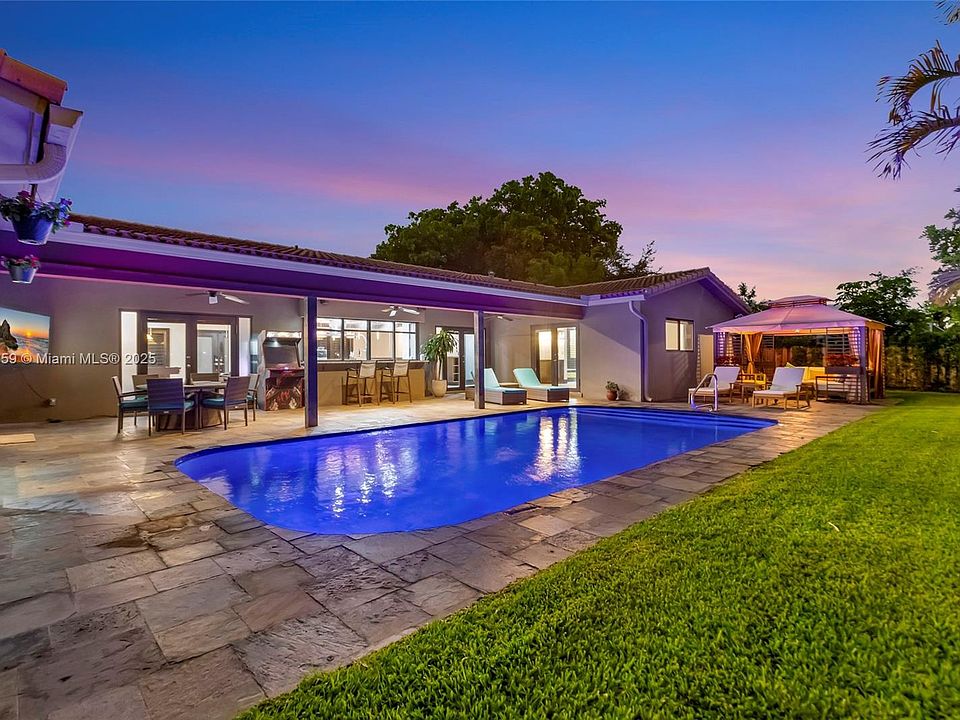 Step into elevated coastal living in Coral Ridge Country Club Estates with this 3-bedroom plus enclosed den (currently styled as a guest suite), 3-bath residence and air-conditioned 2-car garage. An open layout flows into a chef’s kitchen with double ovens, granite counters, wine cooler, and a cooking island with a pass-through bar to the covered veranda, designed for seamless indoor outdoor entertaining. Two private primary suites offer custom walk-in closets and French doors opening to the pool. Nearly every room overlooks the outdoor oasis featuring a cabana, hammock lounge, and spacious fenced yard. Located one block from the golf course and minutes to the beach, premier dining, and top private schools. Arrive by golf cart and live the Fort Lauderdale lifestyle.