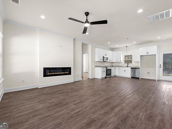 Stunning electric fireplaceCrown moldingSplit bedroom planOpen-concept designCeiling fansRecessed lightingGranite counters
