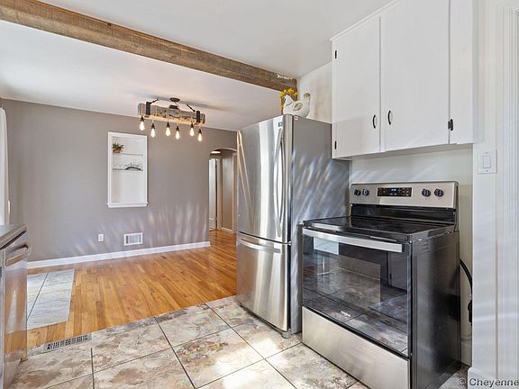 Welcome to a truly captivating two bed, two bath, updated home nestled close to the magnificent Cheyenne Frontier Days park! As you step inside, you are greeted by a warm and inviting atmosphere that seamlessly blends modern comforts with timeless appeal, and the large deck and beautiful backyard are perfect for entertaining.
