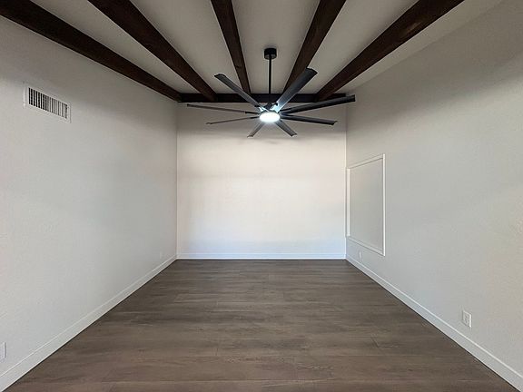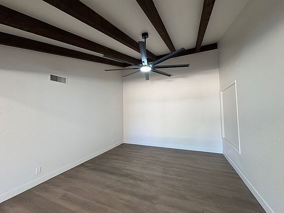 Beautifully Remodeled Modern Home! Step inside this stunningly updated residence featuring an open-concept layout, soaring ceilings with exposed wood beams, and contemporary finishes throughout. The spacious living area is highlighted by rich wood-look flooring and a modern designer ceiling fan, creating the perfect blend of warmth and style. he bright and airy kitchen is a showstopper with white shaker cabinetry, stainless steel appliances, sleek countertops, and an oversized window that fills the space with natural light. Perfect for entertaining or everyday living! The bathroom offers a spa-like experience with floor-to-ceiling marble-style tile, a rainfall shower head, and a custom recessed niche for convenience and style.