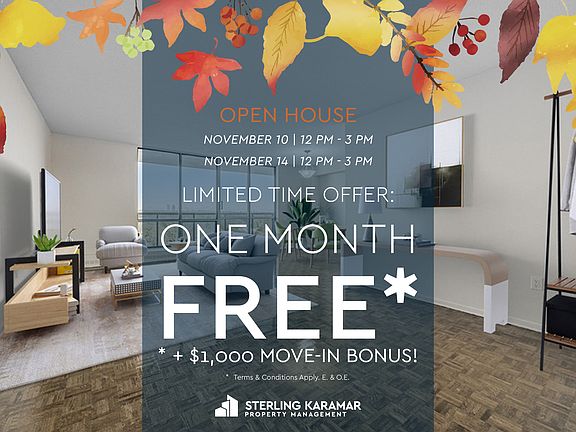- Special offer! Limited Time Offer | Enjoy 1 Month FREE on a 13-Month Lease + $1000 Move-in Bonus for Move-ins by Dec 1!* - Limited Time Offer | Enjoy 1 Month FREE on a 13-Month Lease + $1000 Move-in Bonus for Move-ins by Dec 1!* *Terms & Conditions Apply.