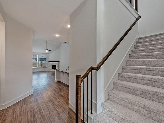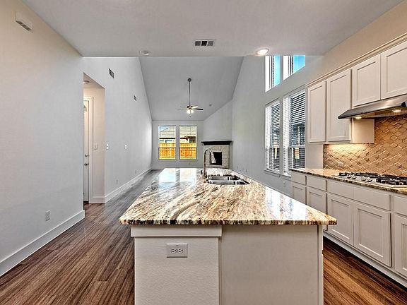 Highland Homes' Kingsbridge plan features 5 bedrooms, 4 full bathrooms, an open kitchen, a spacious family room, and an upstairs game room. Thoughtful upgrades include quartz countertops, a large island, stainless steel appliances, a gas cooktop, custom paint, luxury plank flooring, an 8 entry door with decorative glass, a stone fireplace, iron balusters, and an oil-rubbed bronze lighting package. Enjoy a big backyard with a covered patio, an inviting front porch, a radiant barrier, a tankless water heater, AND A SOLAR SYSTEM.