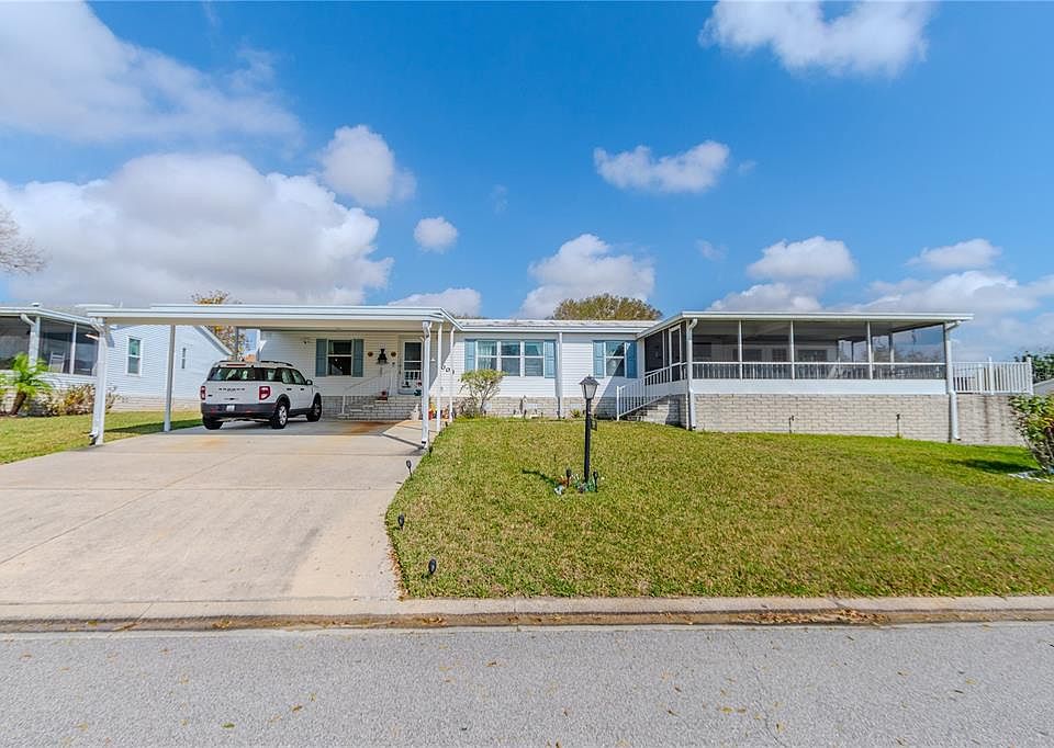 Spacious and move-in ready, this beautifully updated 3-bedroom, 2-bath home offers 1,818 square feet of comfortable living space in a desirable 55+ community. Featuring a split floor plan for added privacy, this home also boasts a versatile bonus room and a huge screened-in porch—perfect for relaxing or entertaining. The double carport provides covered parking for two, and a large storage room ensures you have plenty of space for your belongings. Enjoy a vibrant lifestyle with an array of amenities, including an 18-hole golf course, clubhouse, pool, dog park, tennis courts, an on-site restaurant, and more, a short walk or golf cart ride! Your low HOA fee covers yard maintenance, cable, internet, and a guarded security gate for peace of mind. Surrounded by beautiful lakes, this location is ideal for outdoor enthusiasts who love boating, fishing, and recreation. Plus, you’re less than 45 minutes from Orlando International Airport and all the world-class attractions the city has to offer. Whether you’re looking for a home near the Atlantic or Gulf Coast, this prime location offers easy access to both. Don’t miss out on this incredible opportunity!