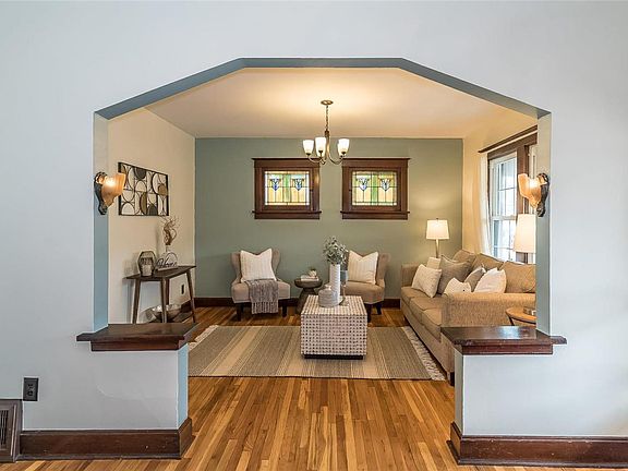 Appreciate old world charm w modern conveniences from the large front porch, lovely original glass front door, gorgeous natural woodwork, wide baseboards & moldings, stained glass windows living & dining rooms, neat archway w sconces between living & dining room & lovely wood floors. 4 sides brick. Flexible floor plan lives large. Updated kitchen w custom cabinetry w soft close doors & drawers, some drawers rollout, some glass fronts, quartz counters, large deep sink w gooseneck pullout faucet, gas range, dishwasher, stainless appliances incl refrigerator, one under cabinet light. Walk-in pantry. Updated bath incl tub w doors, ceramic tile floor, wood vanity w drawer stack & gooseneck faucet, mirror & lights. Enjoy the enclosed functional back porch overlooking the fenced rear yard & patio. 1 car oversize garage w opener & alley access. Mostly insulated windows. Central vac. Updated electric panel. Humidifier. Architectural shingle roof. Walkup basement. Charming workbench remains.