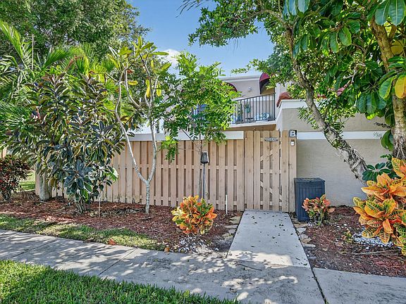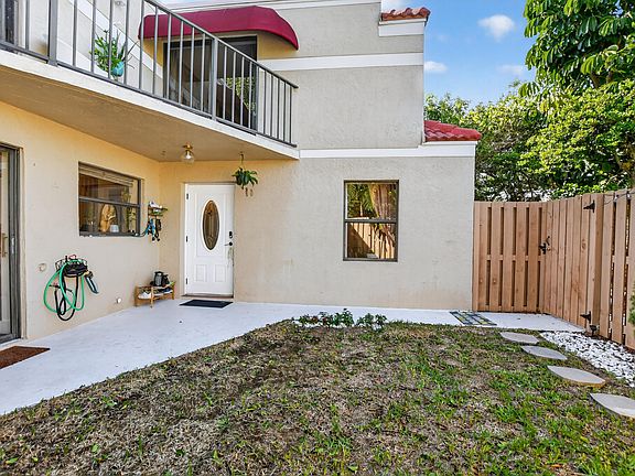 Renovated 3 bedroom, 3 bath townhouse in the heart of Delray. Fenced in private courtyard is perfect for entertaining, gardening, pets/kids to play in your own private area complete w/new storage shed. Modern dark laminate flooring on first floor and stairs, mounted cabinet in dining room for storage/serving, new doors/casing, baseboards, lighting, fans, bathrooms feature new vanities and toilets. All appliances are upgraded-refrigerator, range, dishwasher, microwave, washer, dryer. One bedroom and full bath down, upstairs are two more bedrooms w/en suite bathrooms. Home comes with two reserved parking spots, is pet friendly, no waiting time to rent. HOA maintains exterior and roof. Community has two pools, tennis courts, lots of open space and shady trees to enjoy.