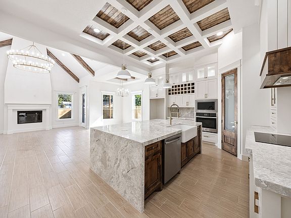 Stylish finishesSleek electric fireplaceInviting open floor planQuartz countertopsNatural lightSoaring cathedral ceilingTray ceilings