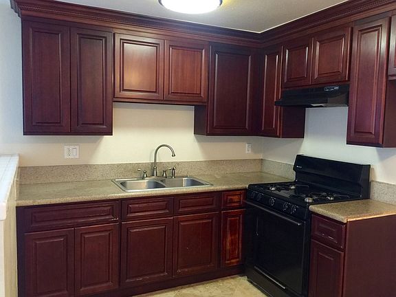 Newly painted spacious two-bedroom downstairs apartment! Living room features Travertine flooring. Kitchen features beautiful cherry wood cabinets, and a brand-new gas stove. The bathroom offers a new vanity and sink. The bedrooms have newly installed carpet and blinds. The building was recently painted and offers one carport parking space in a small, gated complex. No pets. The tenant pays gas and electricity.
