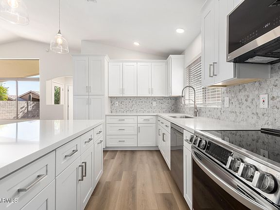 Remodeled and renovated throughout, this GORGEOUS home boasts vaulted ceilings throughout & brand NEW wood-look plank flooring with plush carpet in the bedrooms. Your brand NEW kitchen is complete with upgraded, soft close cabinets and pullouts, quartz countertop, HUGE island, beautiful backsplash, brand NEW matching appliances, & upgraded lighting. Your brand NEW bathrooms received equal treatment with new quartz countertops, NEW soft close cabinetry, NEW toilets, & NEW showers. Out back, you'll enjoy an oversized, covered patio overlooking mature landscaping. Located in the desirable Mountain Park Ranch community of Ahwatukee includes access to all 3 community centers which include heated pools, hot tubs, playgrounds, volleyball courts, tennis courts, & large grassy areas. Also included is access to the private community pool within The Landings community. An absolute gem of a home you'll be proud to own!