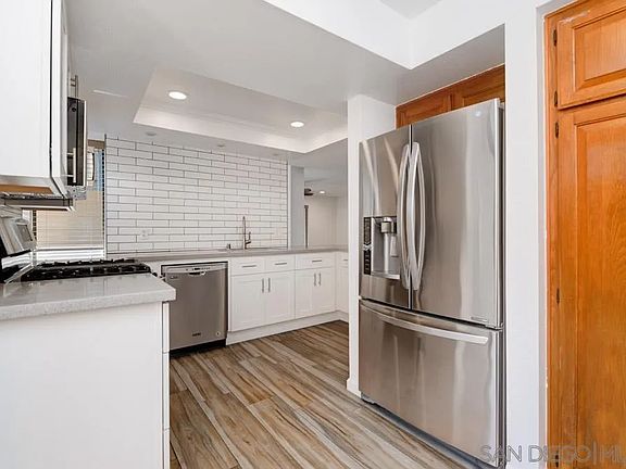 This beautiful, coastal 2 bedroom 2.5 bath townhome boasts a prime location West of I-5 within the gated community of Windsong Cove. Residents enjoy being steps to the community pool and spa surrounded by lush tropical-style landscaping while also being walking distance to the beach and Carlsbad Village. The home is well-appointed with an updated kitchen with quartz countertops and wood-look tile throughout the first floor. Cozy up next to the fireplace on cooler nights. Full sized laundry is located conveniently outside the upstairs bedrooms, and each bedroom has its own ensuite bathroom. Outdoor space abounds with two patios, one of which has a natural gas connection for a personal BBQ, although there are community BBQs located near the pool, just steps from your patio. The attached, direct access 1 car garage is a luxury you will appreciate when carrying in groceries while you will also have one other assigned parking space within the community. HOA fees cover gated access, exterior building and grounds maintenance, landscaping, roof, water, gas, and trash. Photos are virtually staged to provide inspiration for the use of the space.