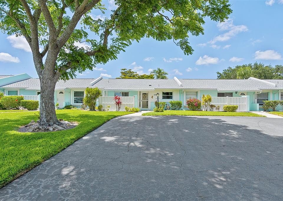 This UPGRADED condo unit within the 55+ community of Cortez Villas 12 boasts a stunning vaulted ceiling and a prime location within the community. Step out your back door and enjoy easy access to the heated community pool and clubhouse! The front courtyard is perfect for grilling, sunbathing, or gardening. Inside, you'll find new ceramic tile flooring throughout the entire unit, fully updated bathrooms, fully updated kitchen w/glass quartz counters and top of the line stainless steel appliances and a convenient in-unit washer/dryer that conveys with the sale! The spacious master suite features a walk-in closet, while the under-ventilation glass enclosed lanai adds extra charm to the great room floor plan. Parking is a breeze with the option to park right at your front door or in the driveway, which can accommodate multiple cars. Unit comes with a utility storage shed. Everything here is newer! Roof is from 2019, HVAC from 2017 and Water Heater from 2016. The low maintenance fees cover exterior maintenance, the roof, water, basic cable, sewer, and trash and more. You'll also have access to a community clubhouse, kitchen, heated pool, shuffleboard, billiards, and library where lots of community activities are hosted! One small pet is welcome!