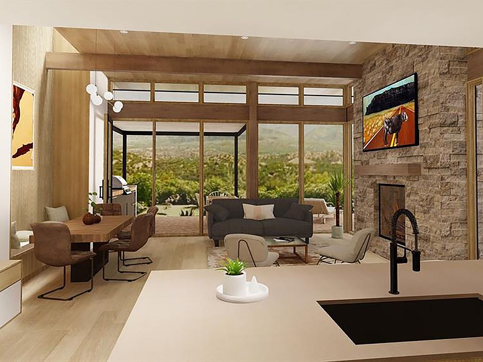 Corner kiva fireplaceContemporary finishesGourmet kitchenTiled bathroomsPlaster wallsOutdoor dining portalOak hardwood floors